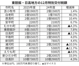 特別交付税12月分 東胆振7.8%増、日高4.3%増